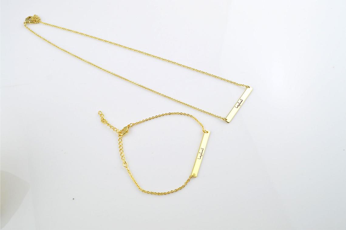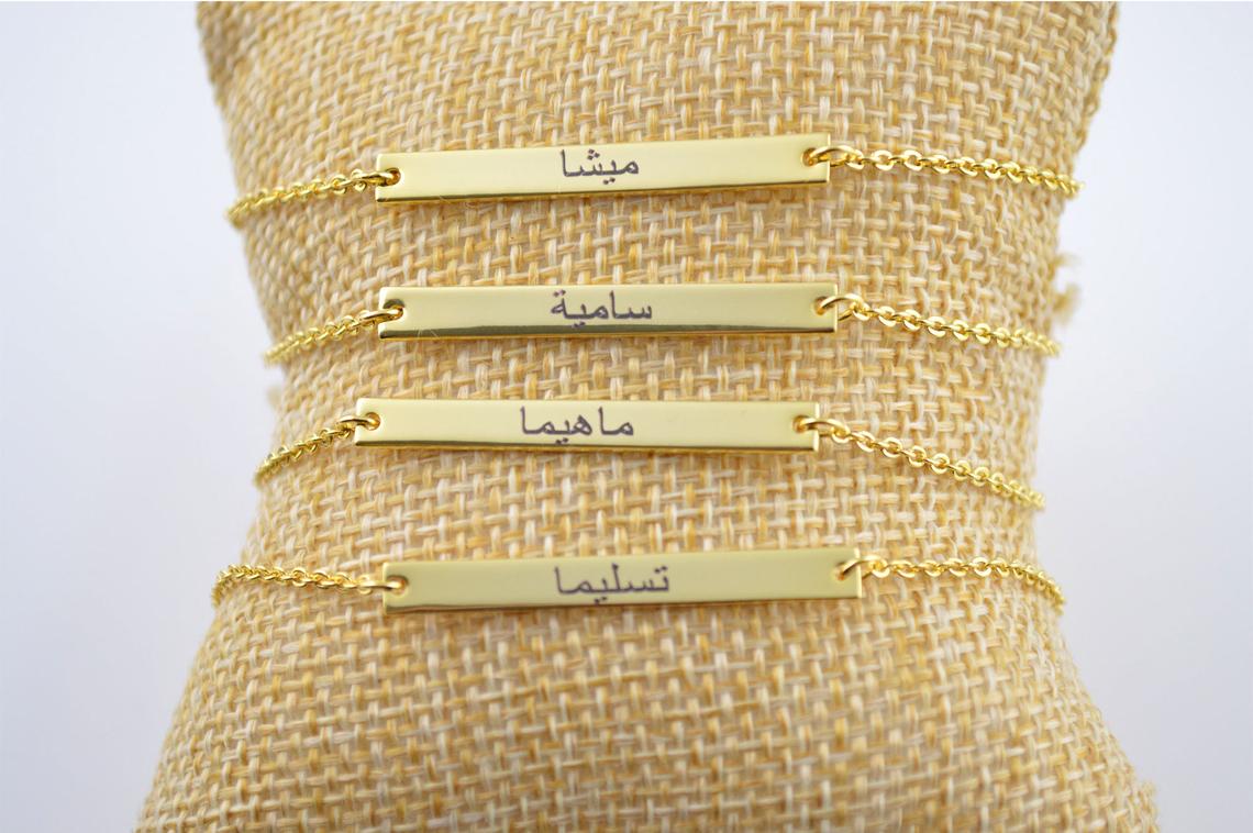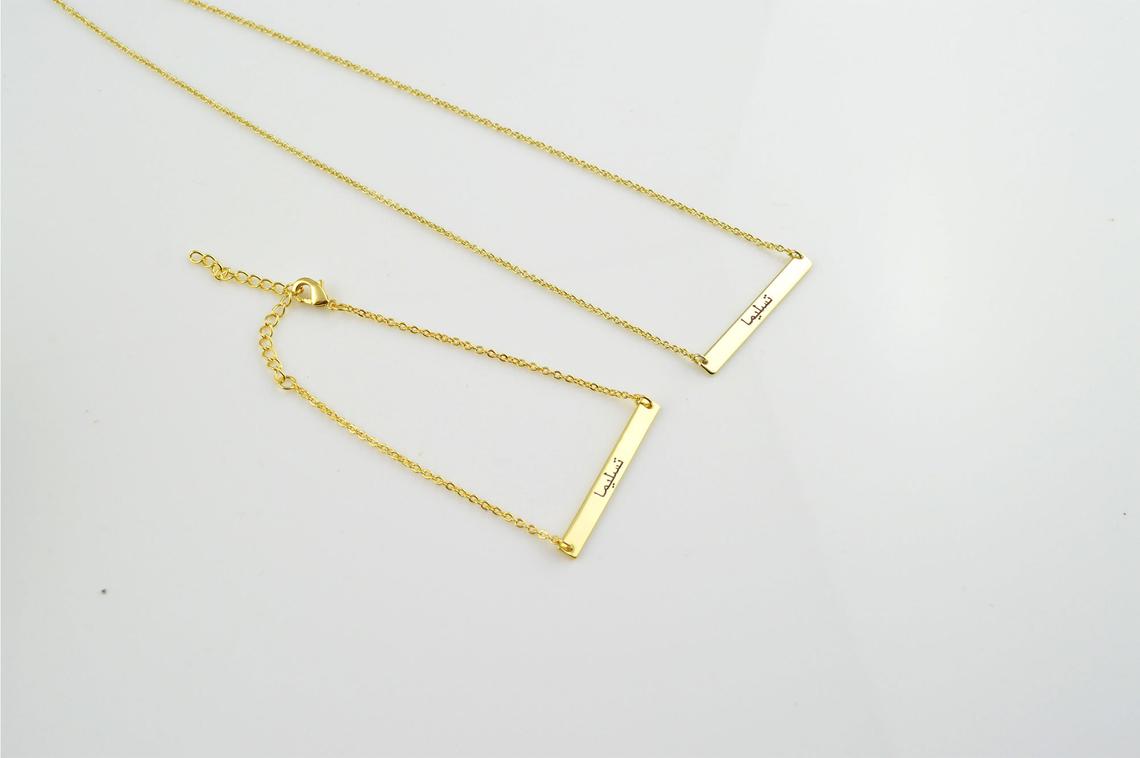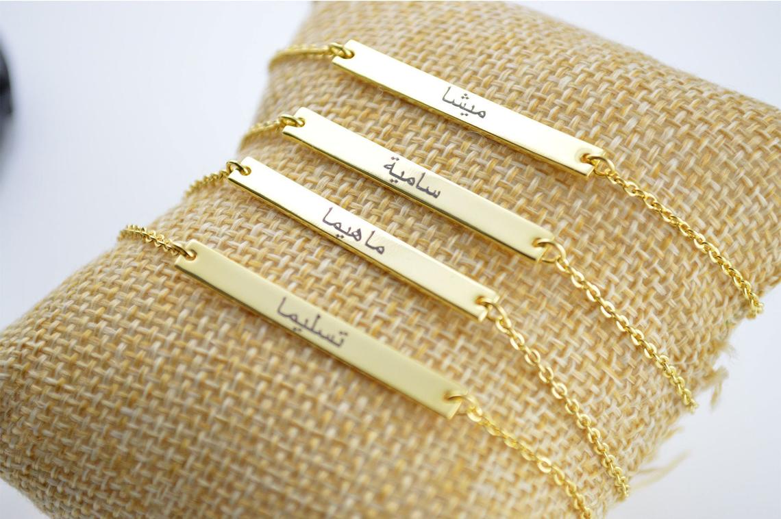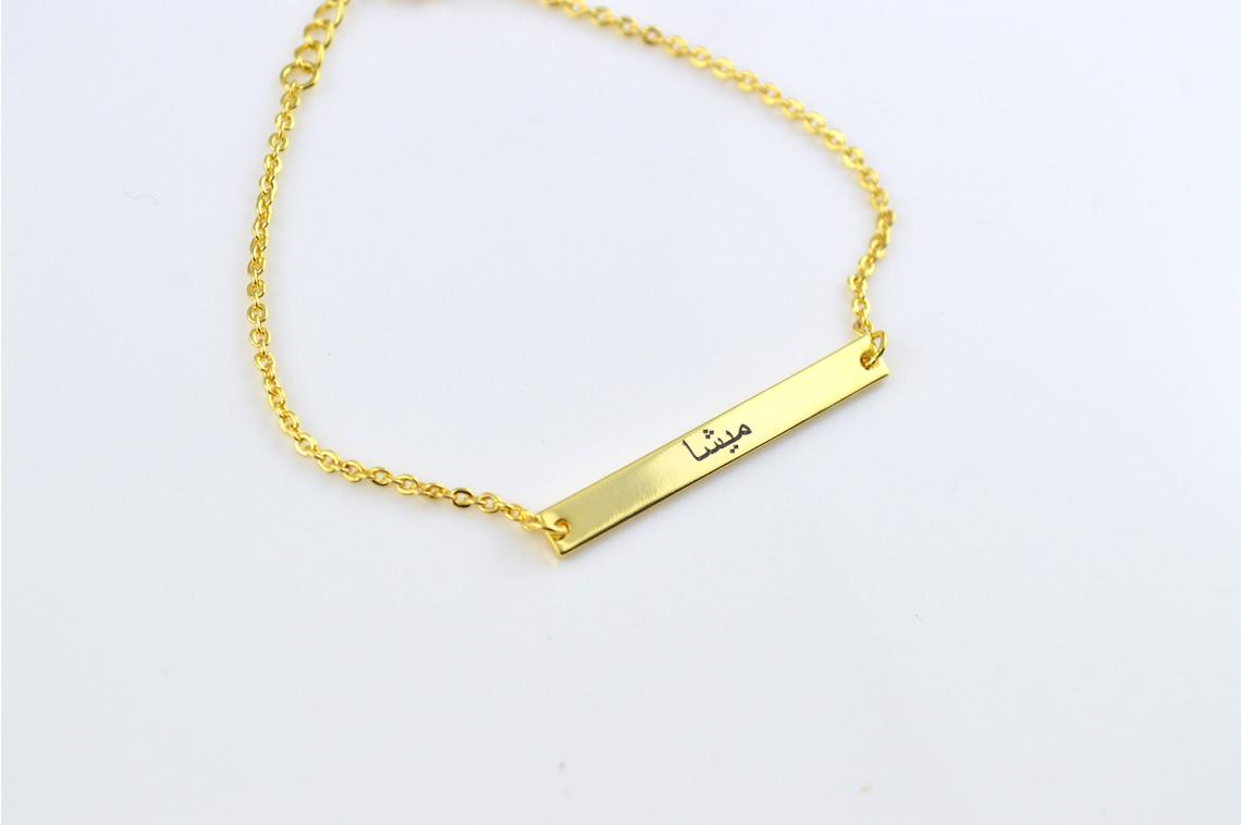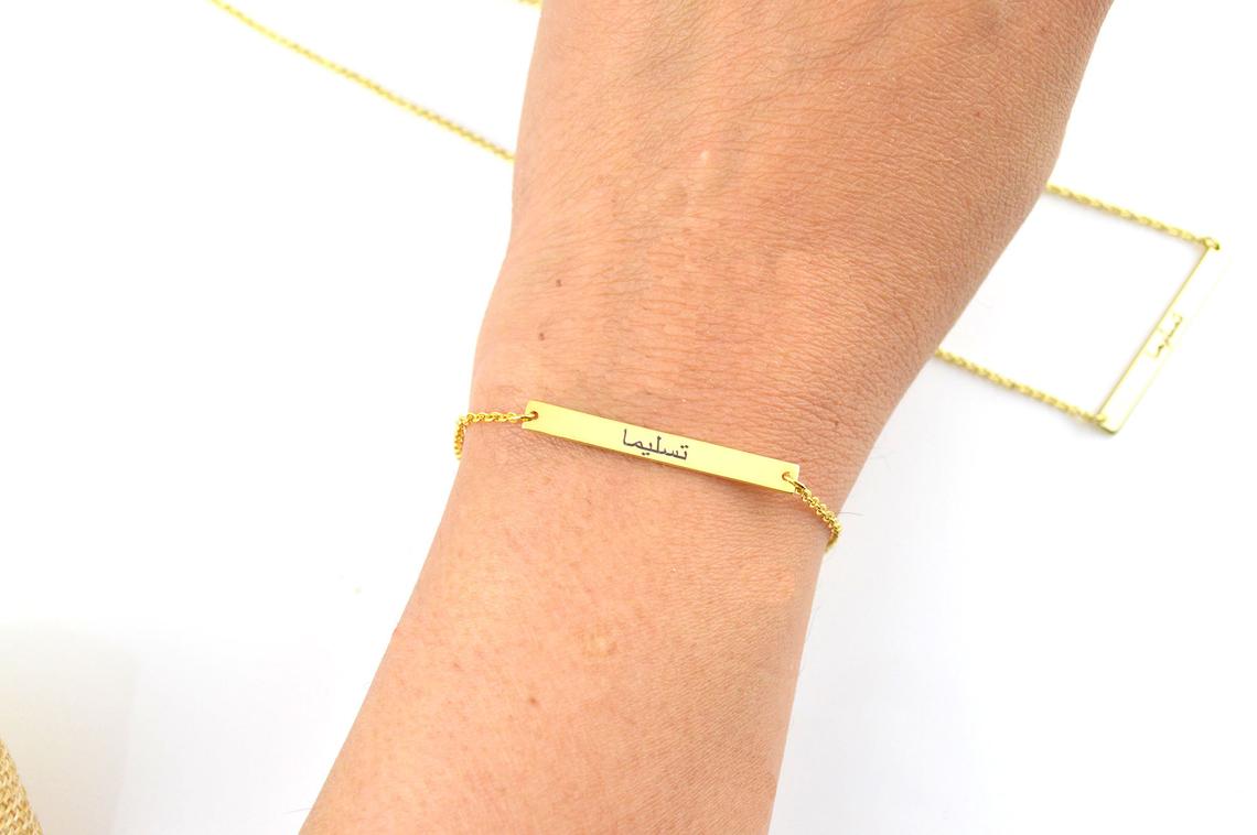 In elegant Arabic script, a name, a prayer, and a message of love are inscribed. Your chosen words become timeless with the Arabic Gold Bar Bracelet, a delicate yet potent memento. This bracelet is a very personal expression of beauty and meaning, whether it bears the name of a loved one, a date to remember, or a blessing. It's a piece designed to be worn close to the heart—every day—and is ideal for giving as a gift during Ramadan, Eid, or just to express love.