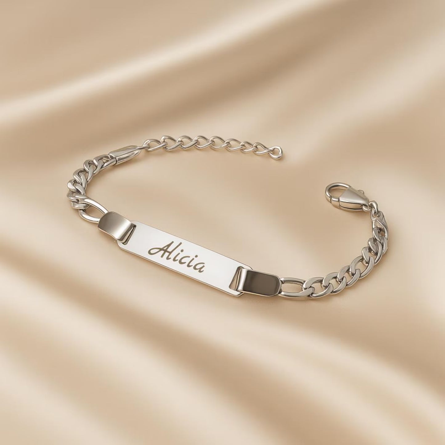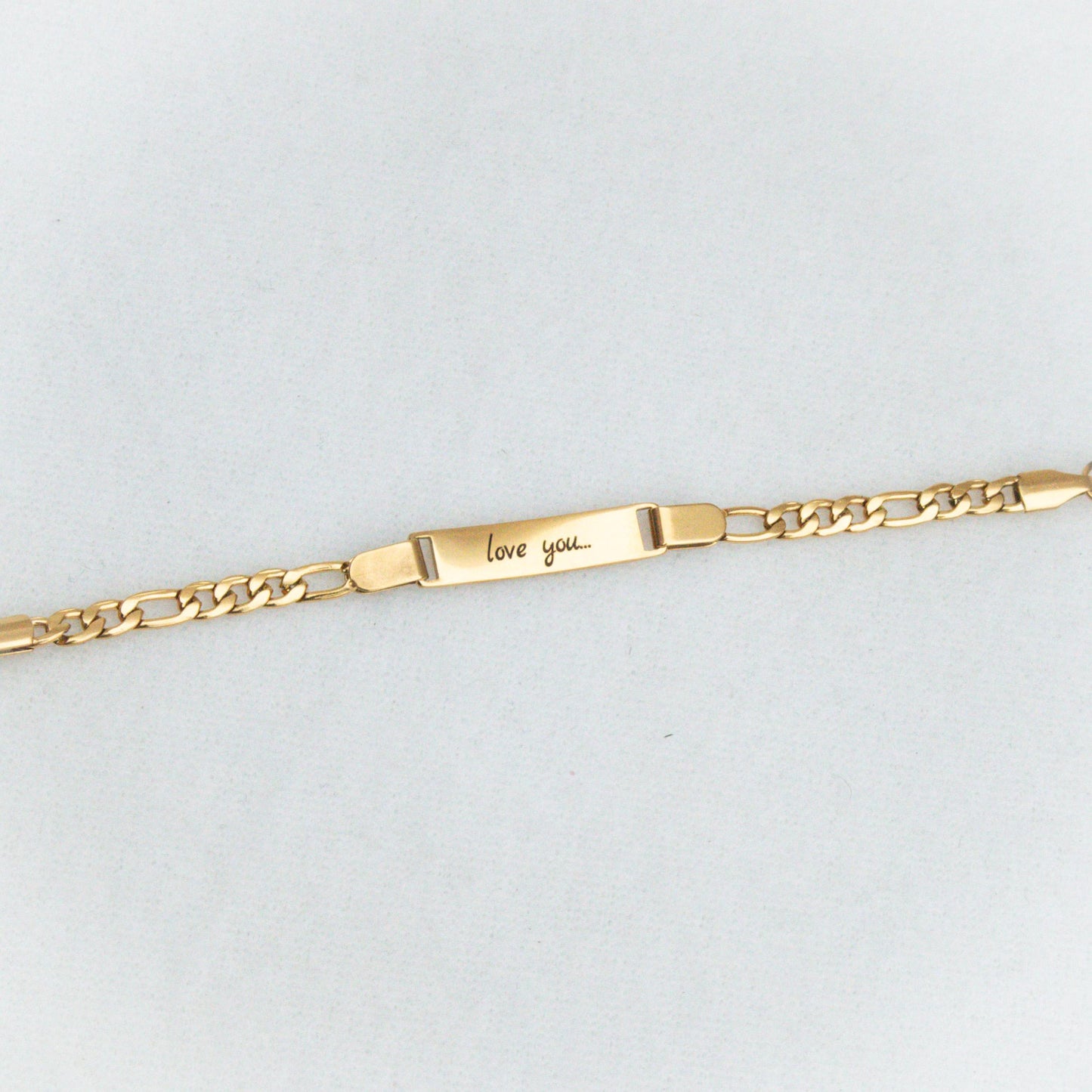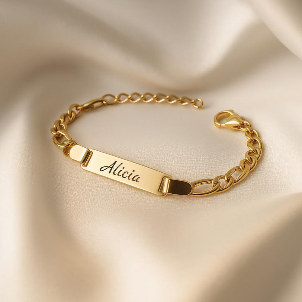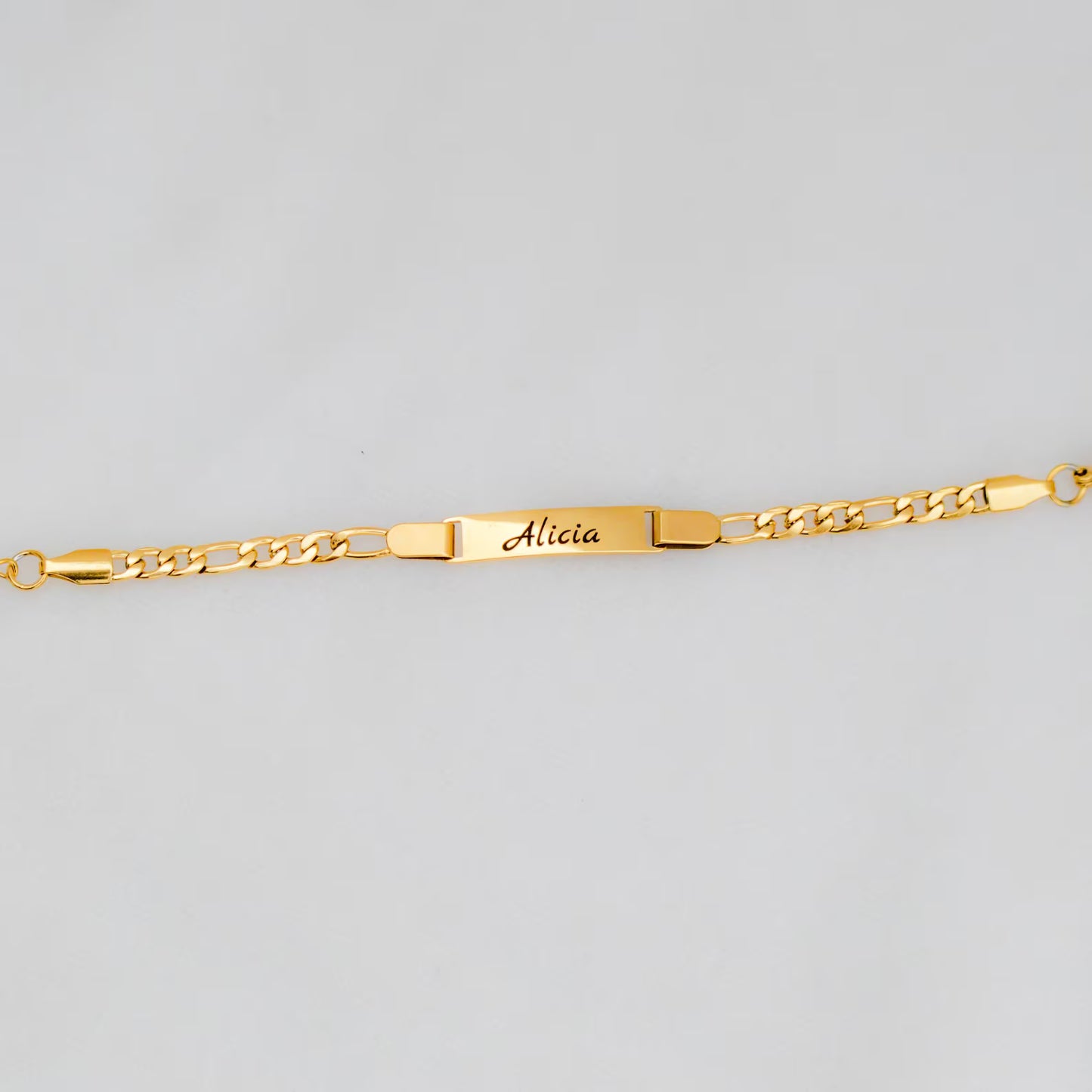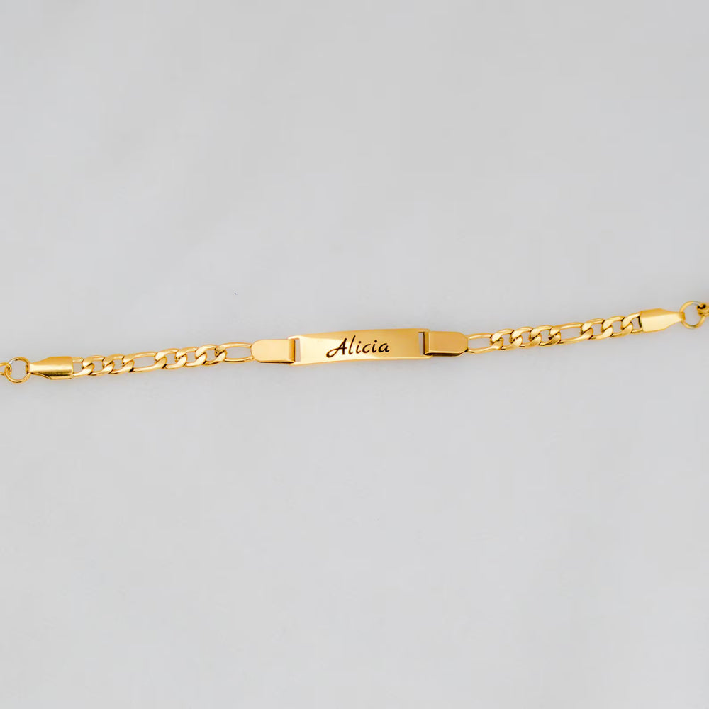 This custom name bracelet for babies and children is the perfect blend of luxury and sentiment. Expertly crafted in your choice of gold or silver, this dainty yet durable piece features a beautifully engraved nameplate — personalized with your child’s name in a graceful script font.
