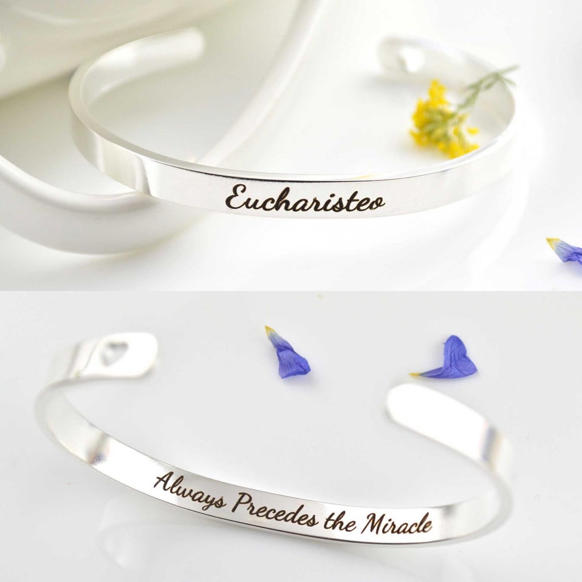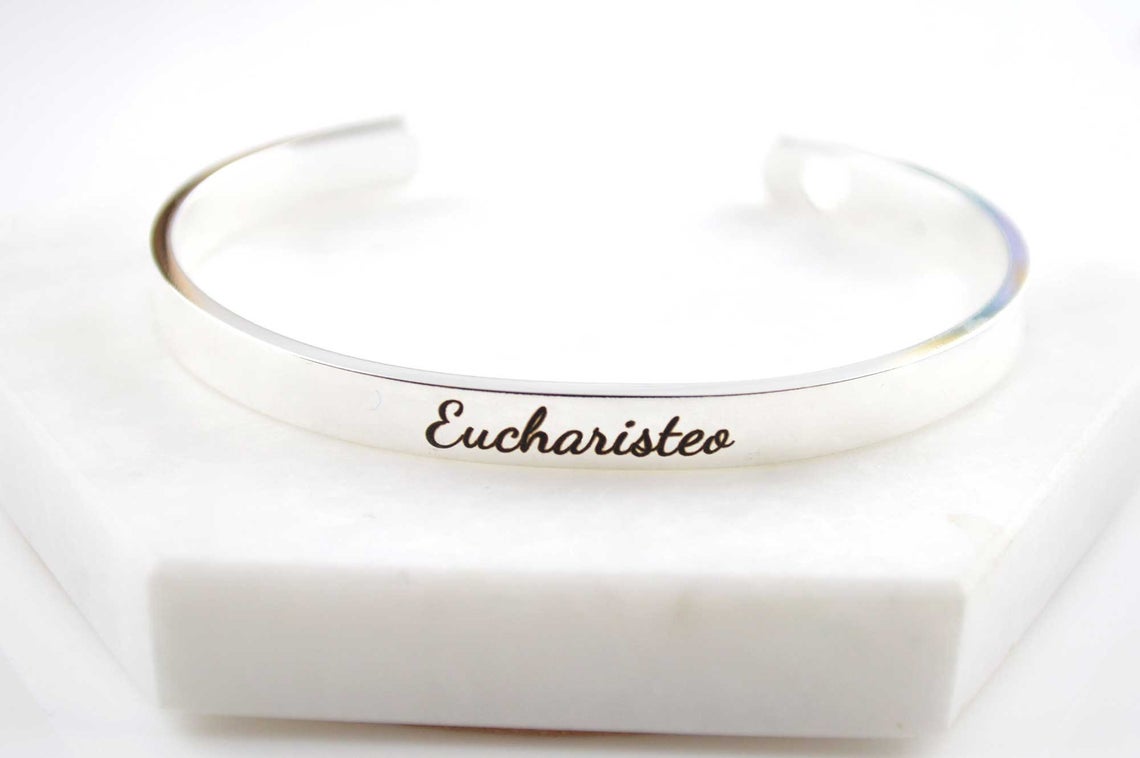 - Thoughtfully engraved with "Eucharisteo" on the outside and a custom message on the inside if you want one.