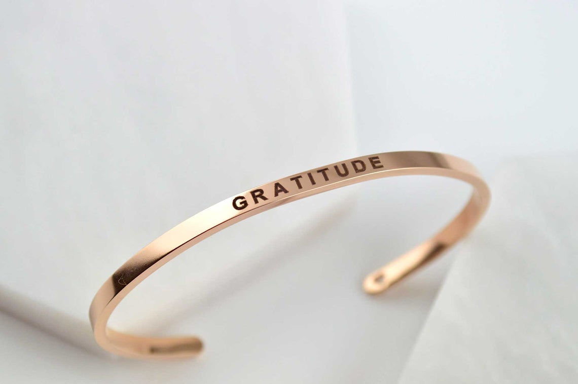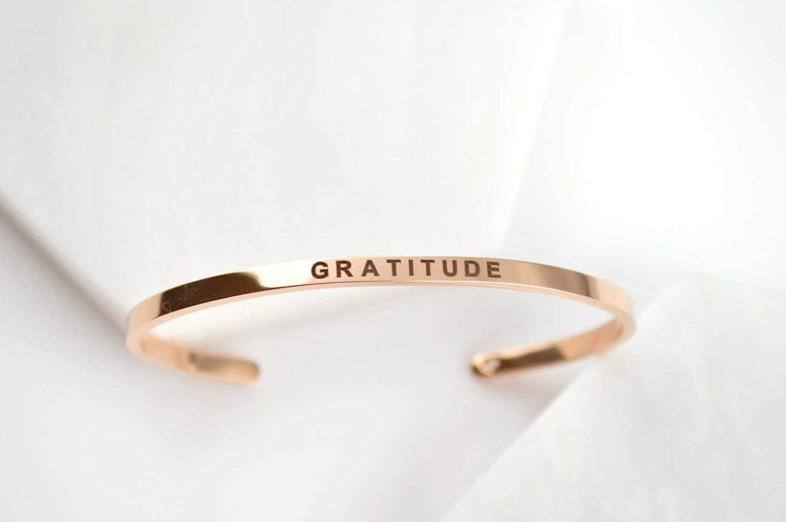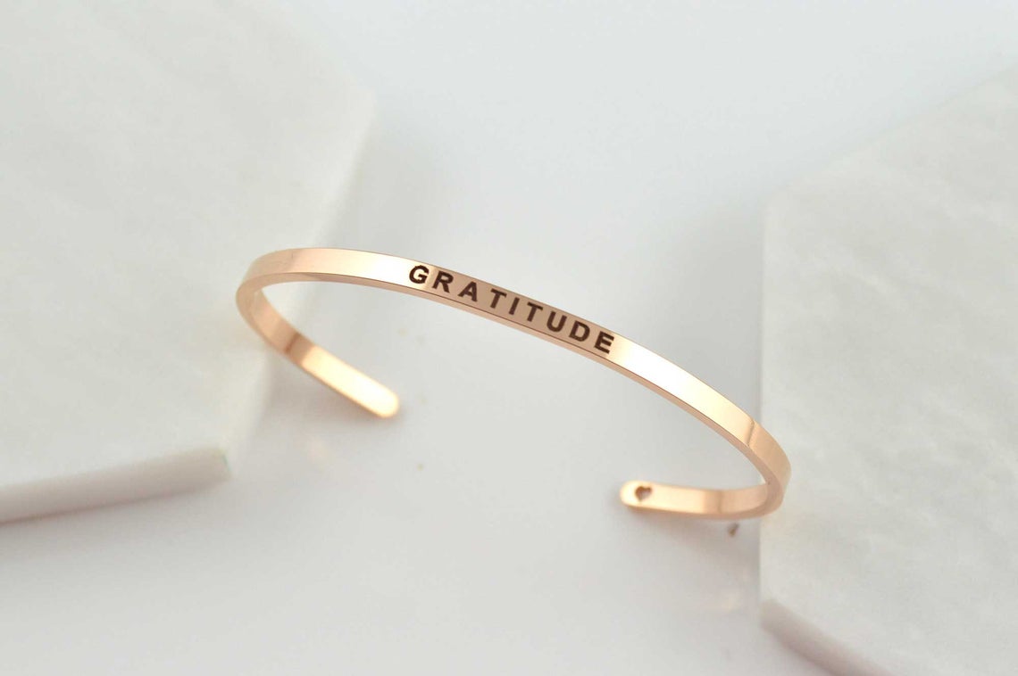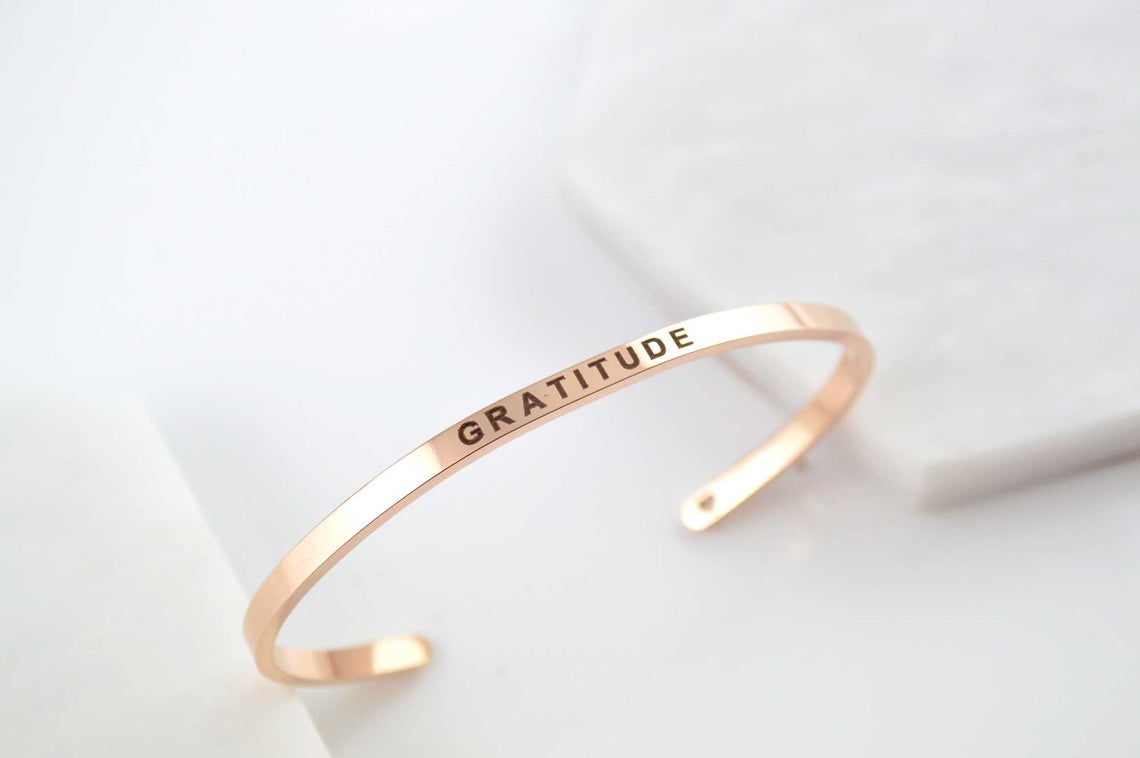 Gratitude speaks loudest in the quiet moments, and wearing something you can wear every day can sometimes be the most meaningful way to keep it close at hand. Whether it's a name, an important date, or a special moment you want to remember forever, our Gratitude Cuff Bracelet is a kind way to remember life's greatest blessings. A personal memento of your own journey or a considerate present for a loved one.