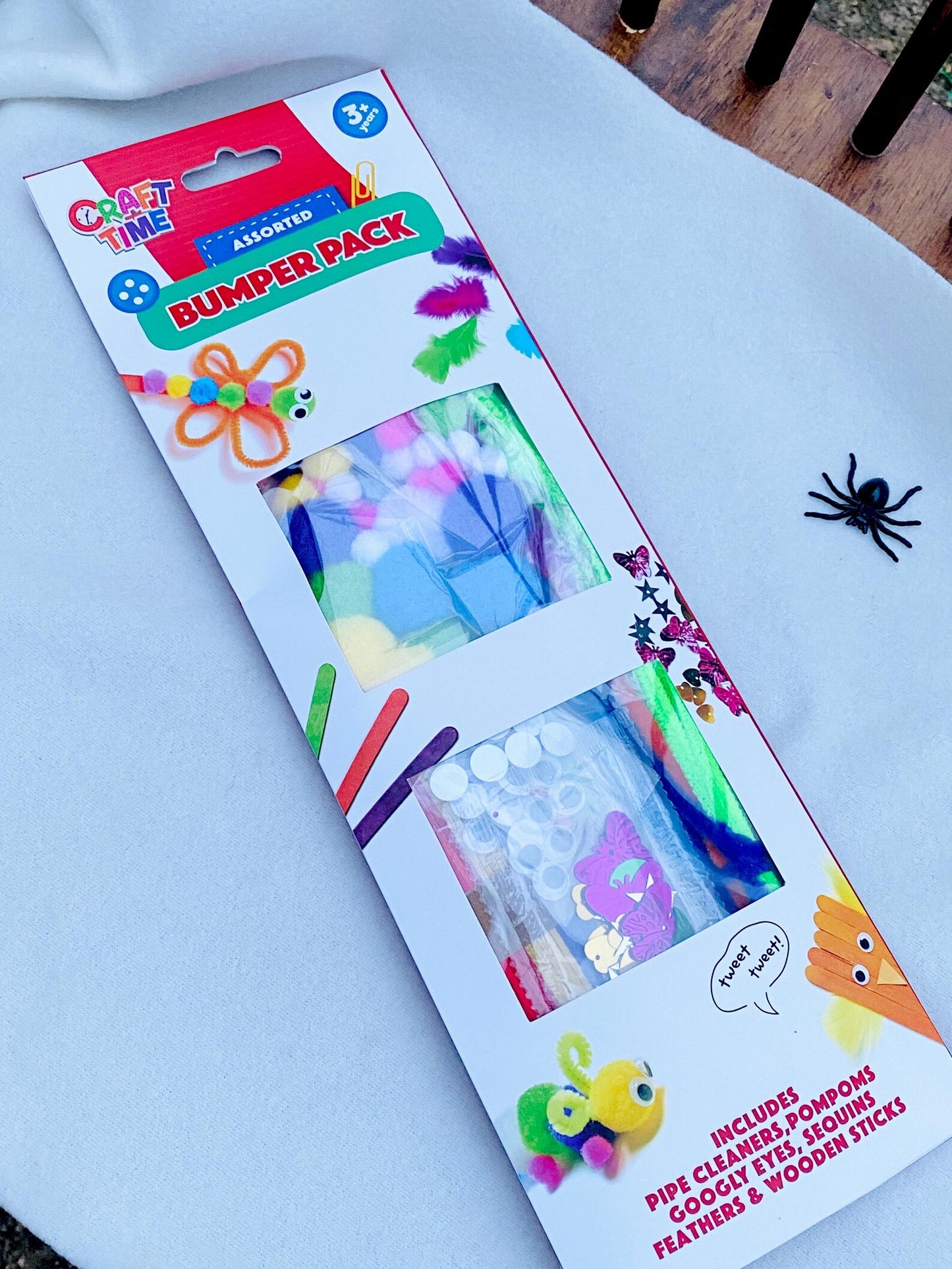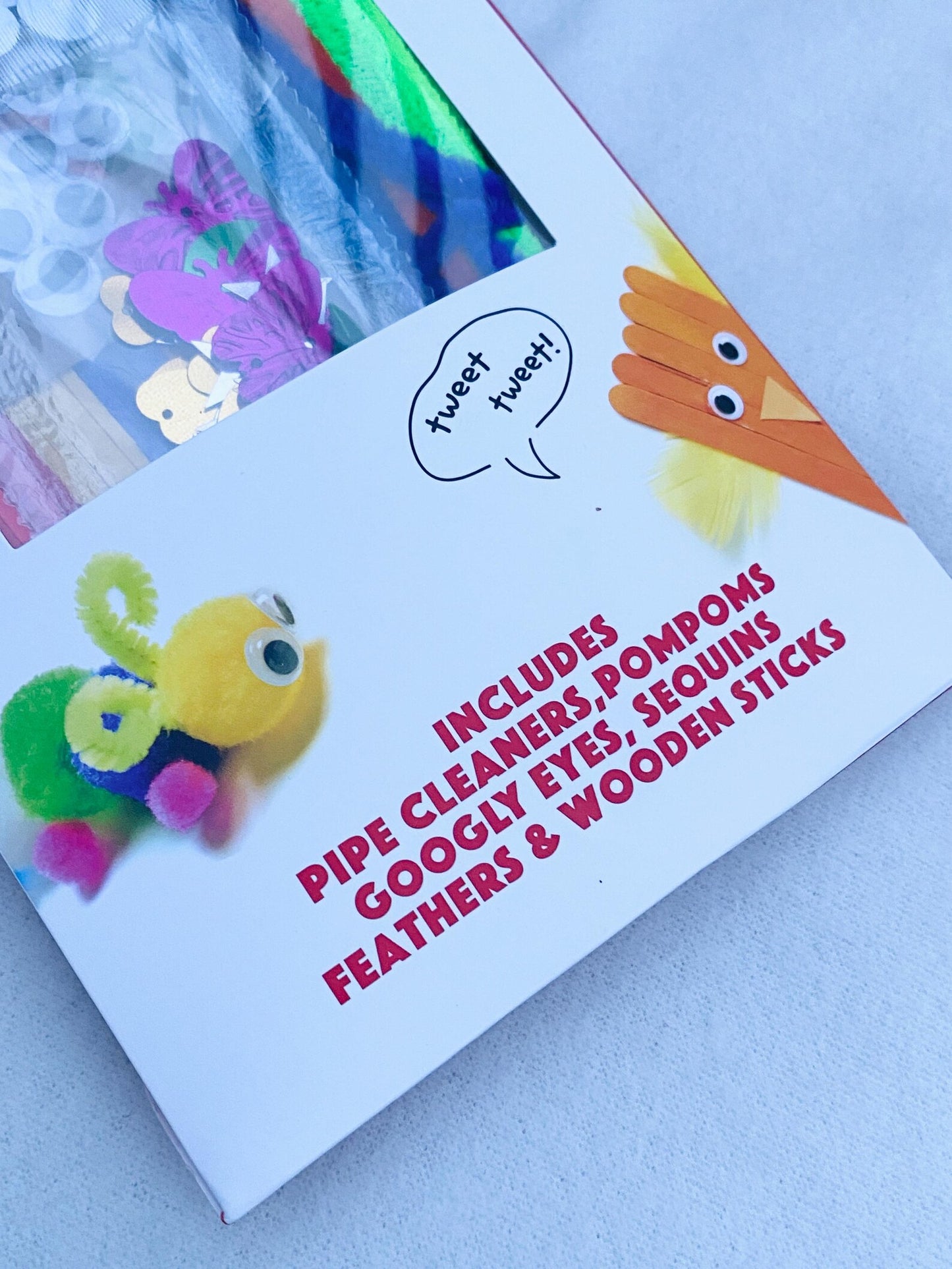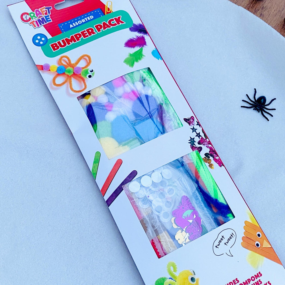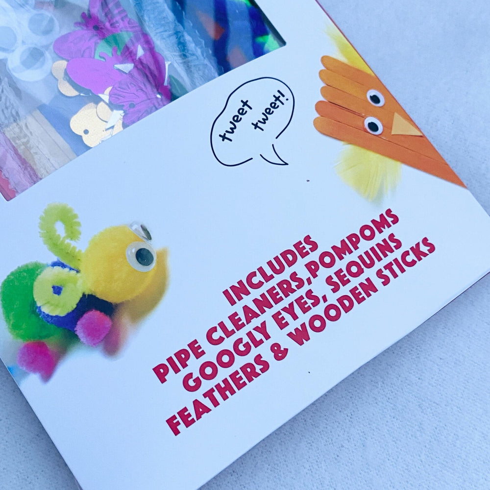 Item 2: A pack of different bumper crafts (pipe cleaners, pompoms, googly eyes, sequins, feathers, and wooden sticks)