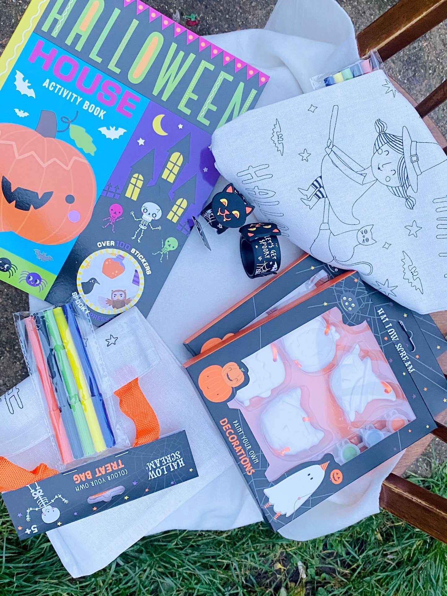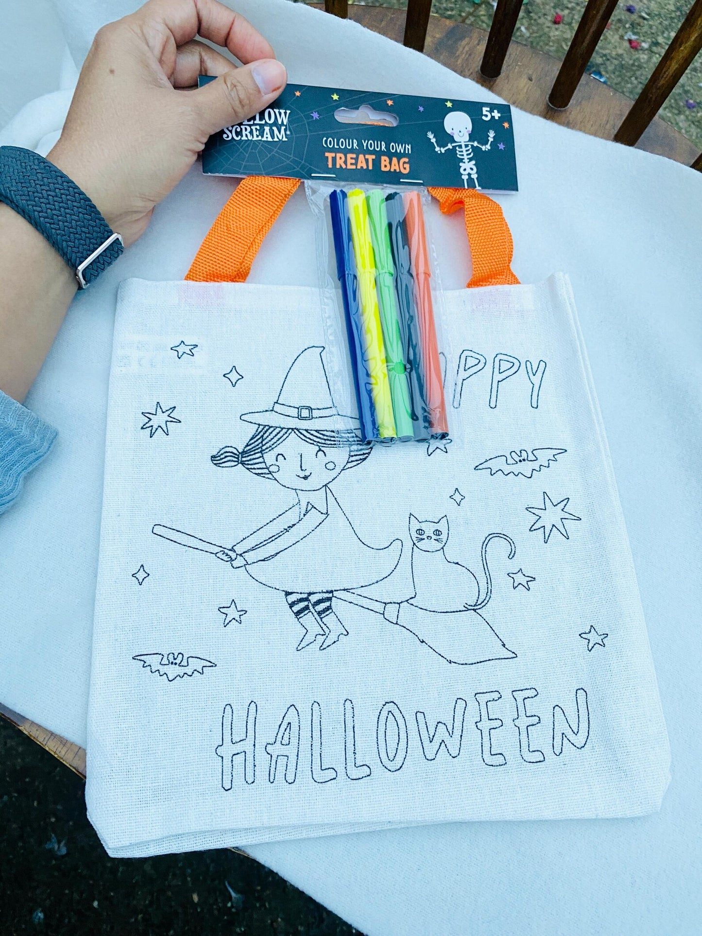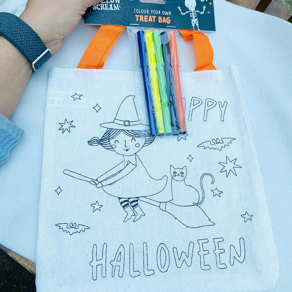 Item 1: A colouring treat bag with five felt tip pens and a tote bag that can be painted.