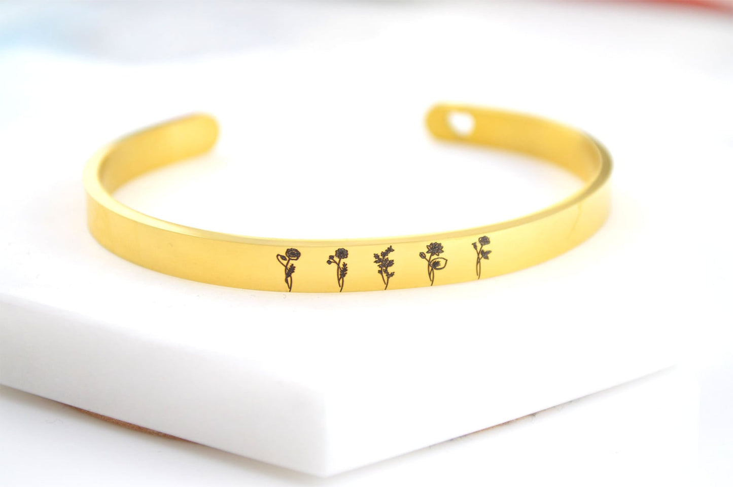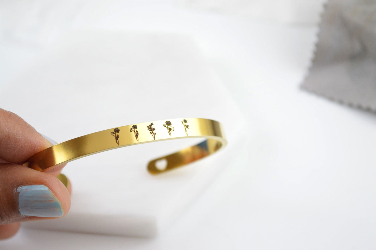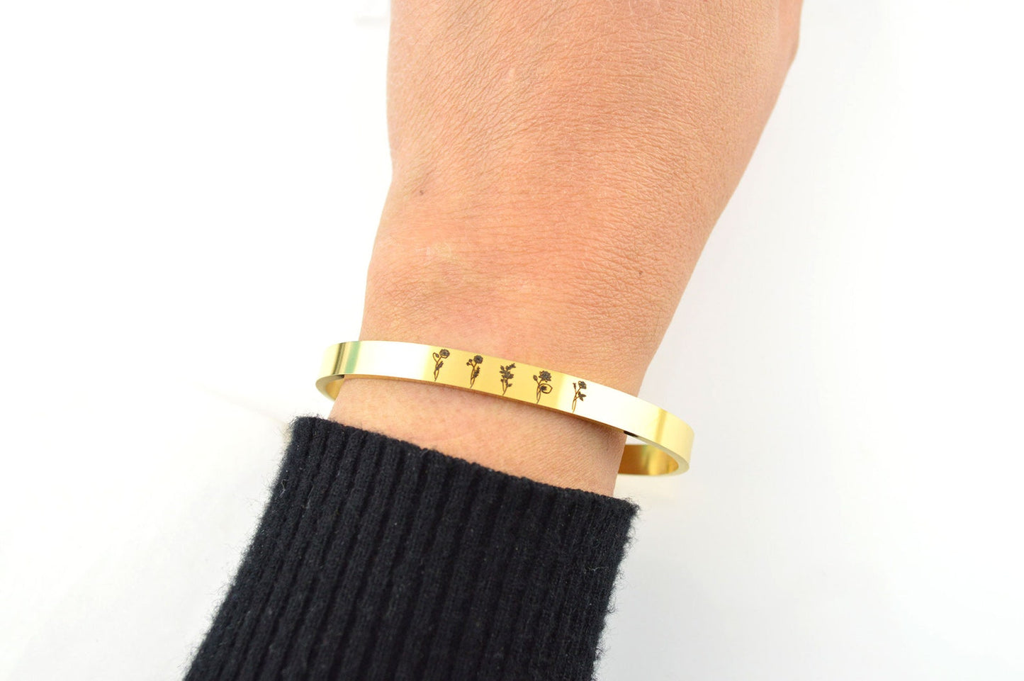 Some memories last forever. The Multiple Birth Flower Bracelet is a lovely way to honour the people who make your life worth living. Each flower is carefully engraved and each petal tells a story. This beautiful cuff captures the presence of your family, friends, or children in a way that is both delicate and timeless. This gift is both meaningful and stylish, making it perfect for birthdays, Mother's Day, or just to say "you are always with me."