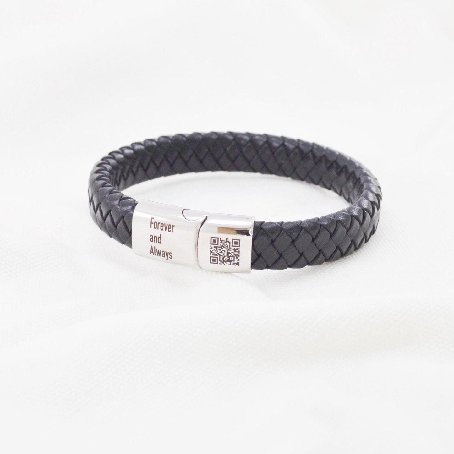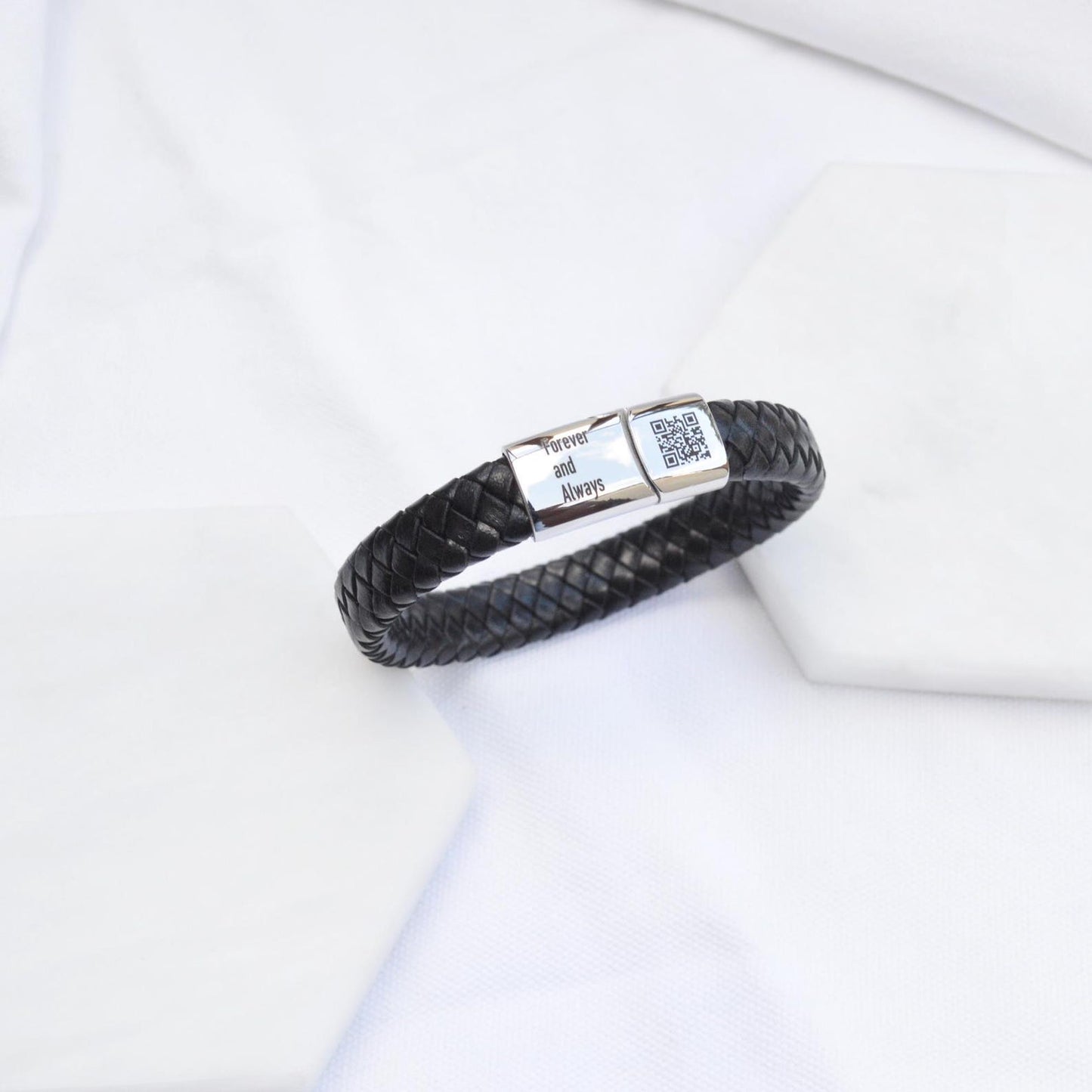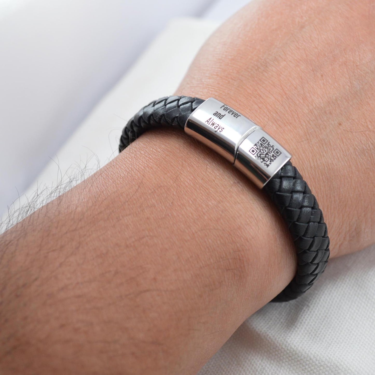 Personalized Men's Leather Bracelet with Engraved Text & QR Code