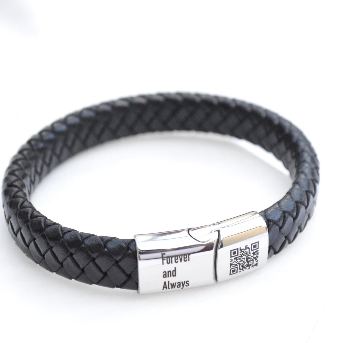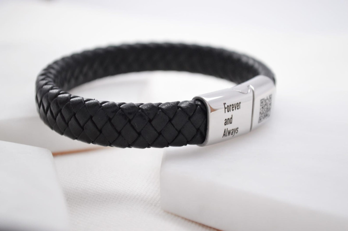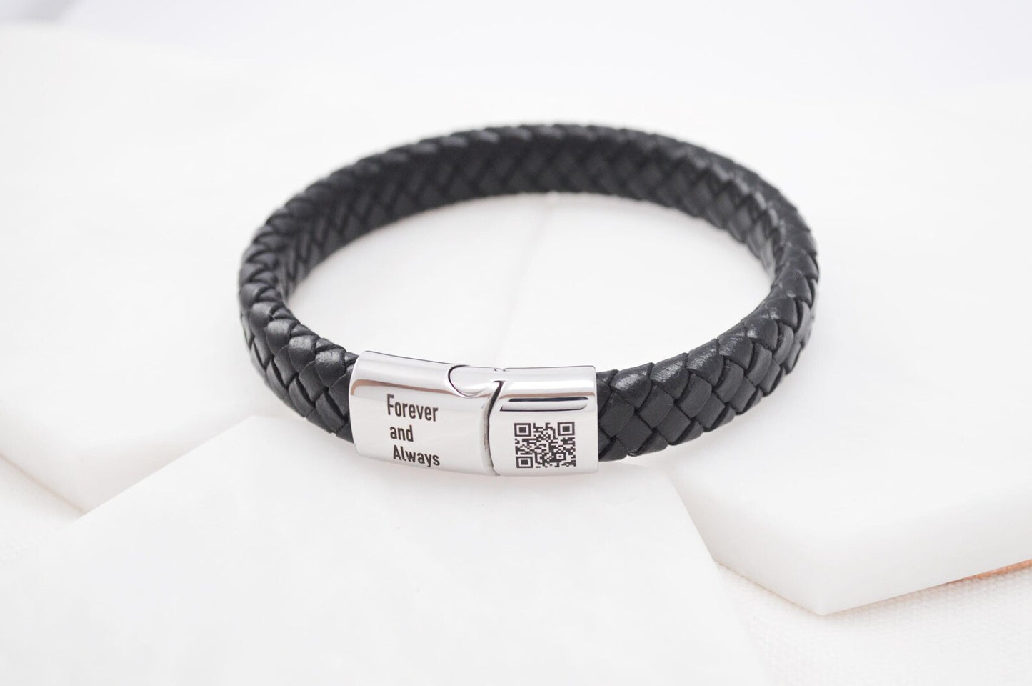 Personalized Men's Leather Bracelet with Engraved Text & QR Code