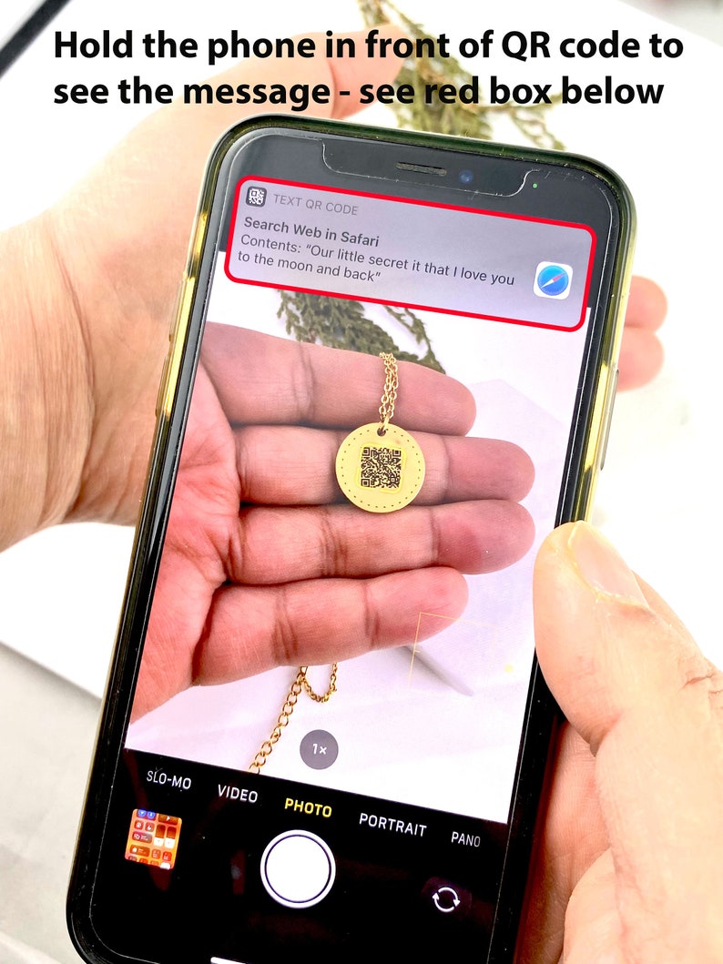 - Customised with a Hidden Message: We'll turn your text or link into a QR code that can be scanned and put on the pendant.