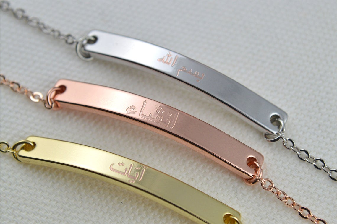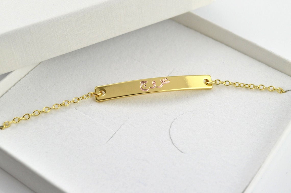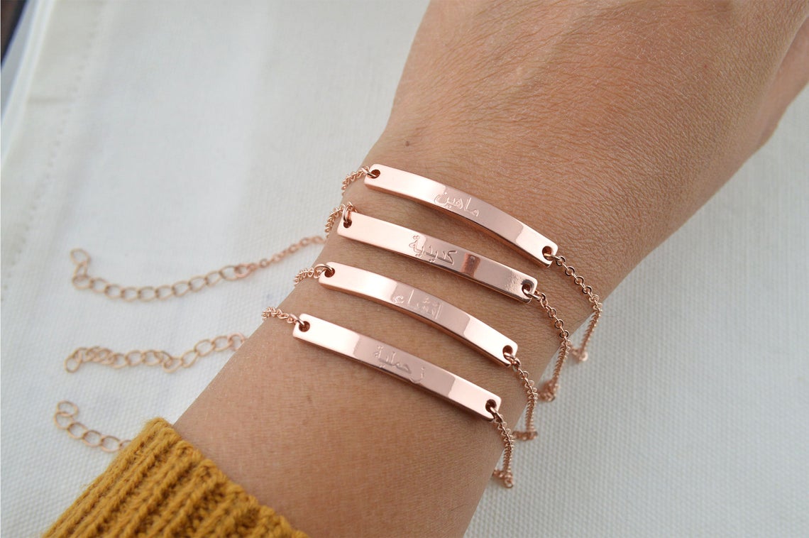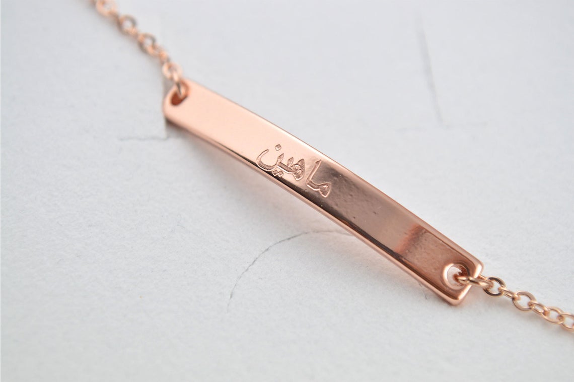 Some words are too important to speak out loud; instead, they should be worn close, whispered, and never forgotten. These words are elegantly honoured by the Rose Gold Arabic Carved Bar Bracelet. This bracelet captures the beauty of language and turns it into a timeless memento, whether it's a name, a date, or a sacred phrase. Engraved in a script that feels poetic on the wrist, it's a delicate yet potent gesture that's ideal for Ramadan, Eid, or just to express love.