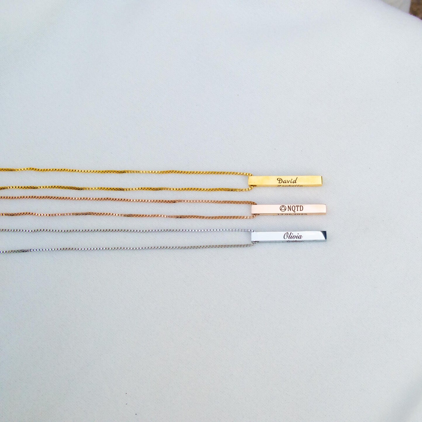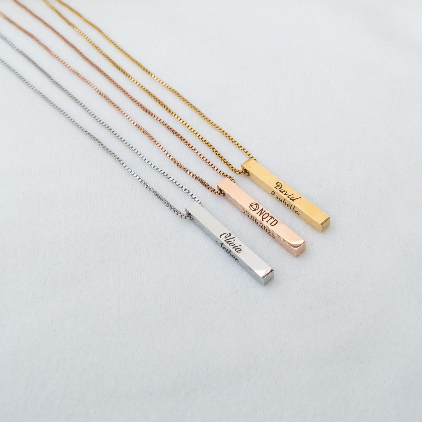 The pendant measures 4 mm × 25 mm and is made of stainless steel with your choice of plating (Gold, Rose Gold, or Silver). The chain length can be adjusted to either 16 or 18 inches.