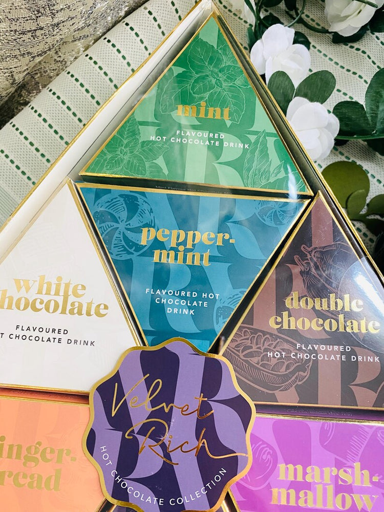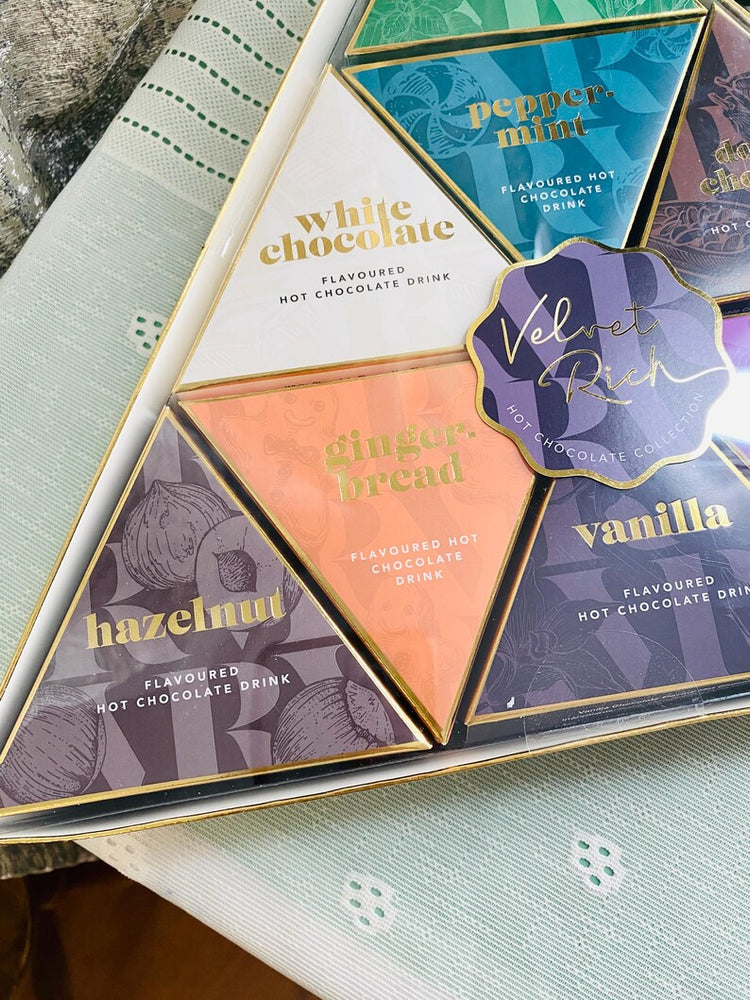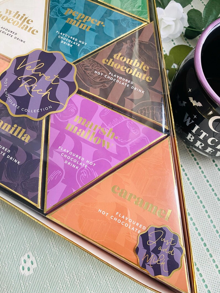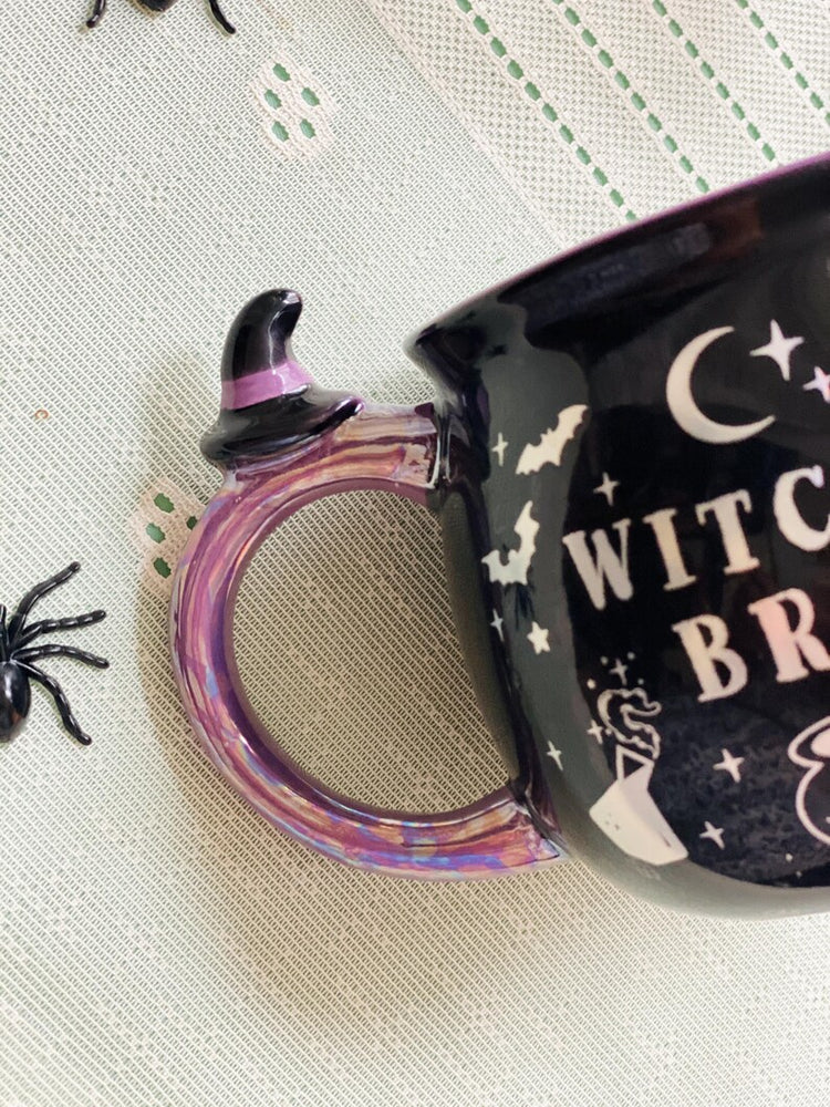 1) A black mug with a silver print, a purple handle, and a small witch hat on top of the handle.
