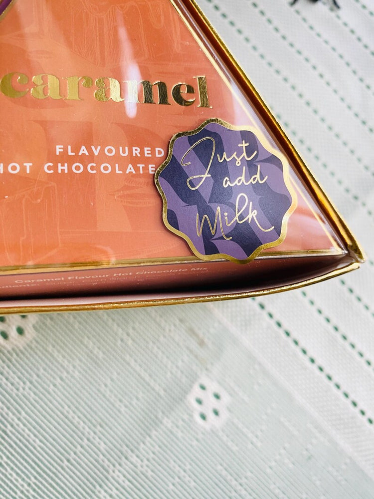 2) A white mug with black print, a purple handle, and a tiny witch hat on top of the handle.